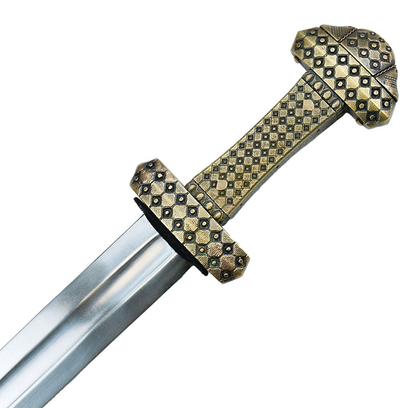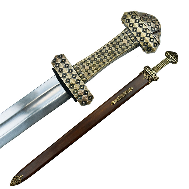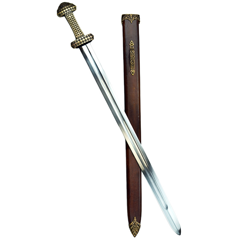 The wood-core scabbard is bound in leather and finished with bronze knotwork accents. It can be worn with its riveted bronze suspension loop.