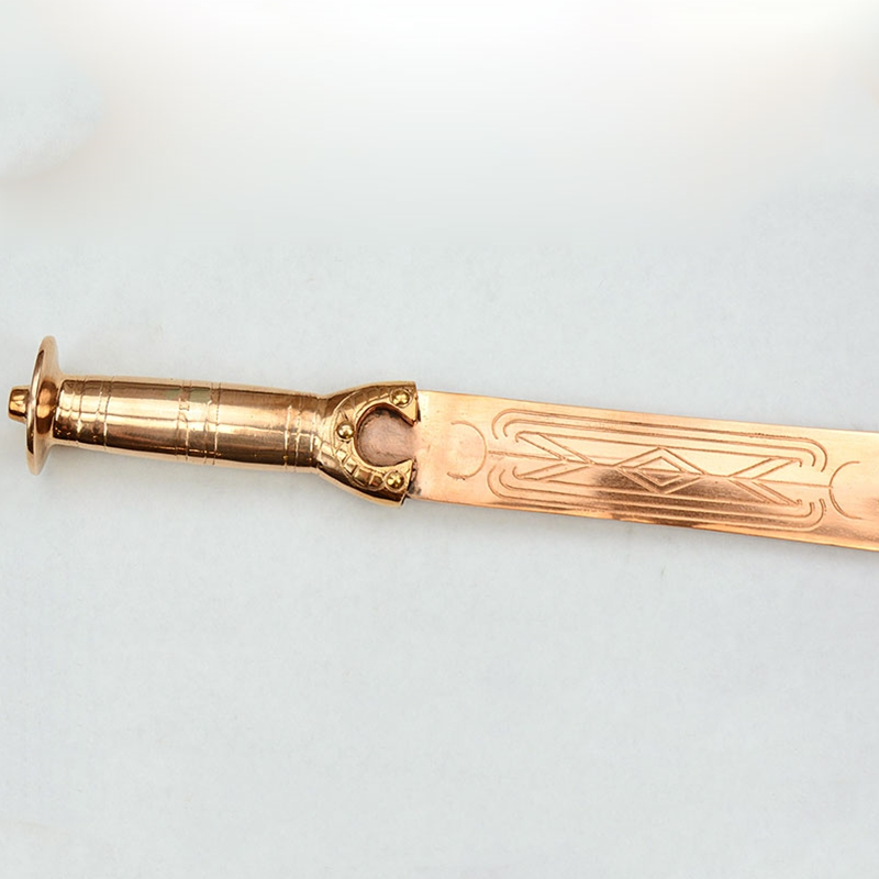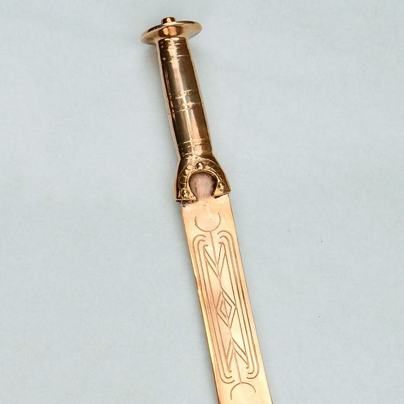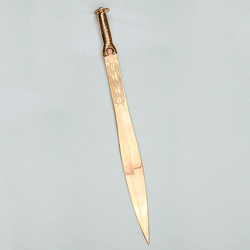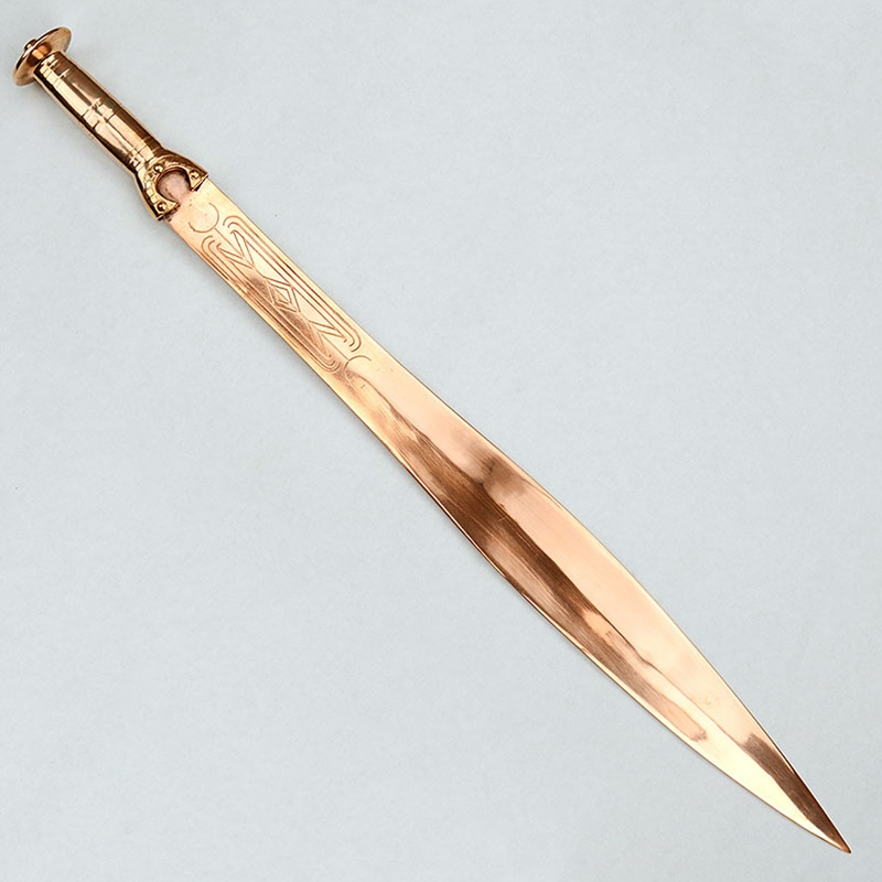 This Celtic bronze sword has a blade and a hilt cast from solid bronze. They are riveted together with bronze rivets in a manner akin to originals. Does not include scabbard.