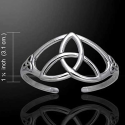 This cuff style bracelet features a trinity of triquetra knots crafted in sterling silver.