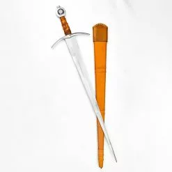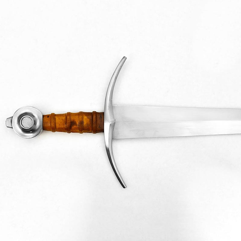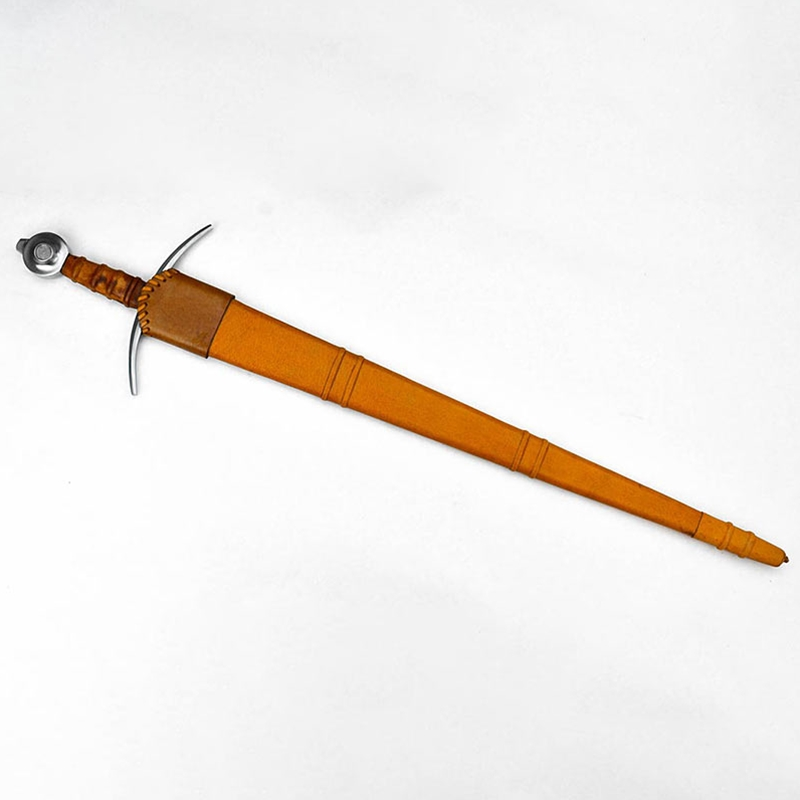 The Comte de Nieuwekerke Sword has a blade of tempered high carbon steel which is durably mounted and peened into a hilt of steel with a wooden grip. The grip is finished with a wrap of leather and a wooden sword with a matching leather wrap completes the sword.