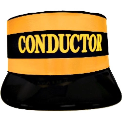 Black train conductor hat with yellow screen printed “Conductor” and gold trim accents. 100% cotton, exclusive of brim and trim.