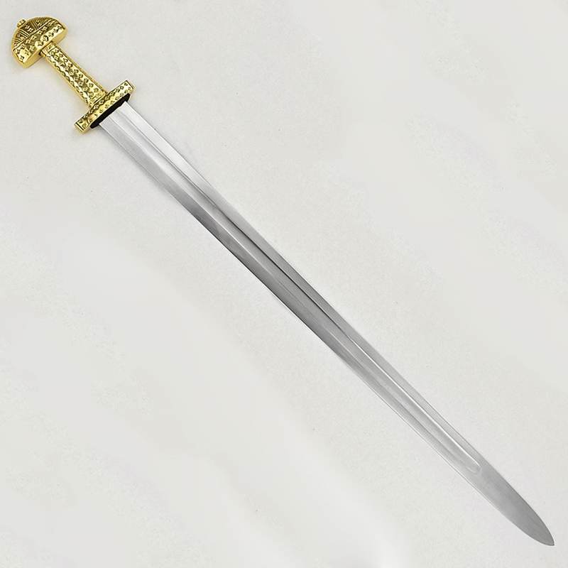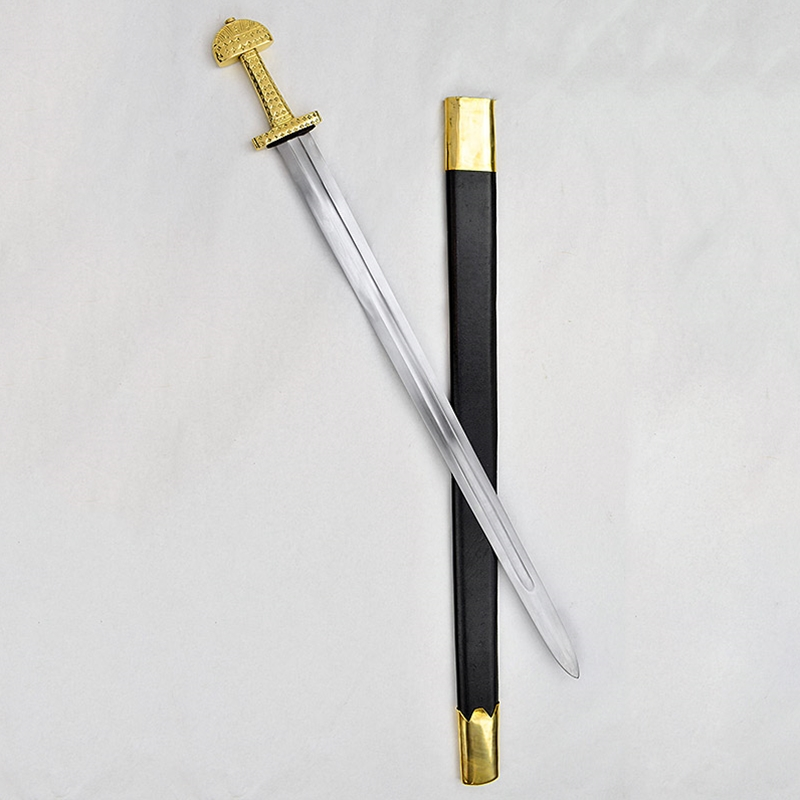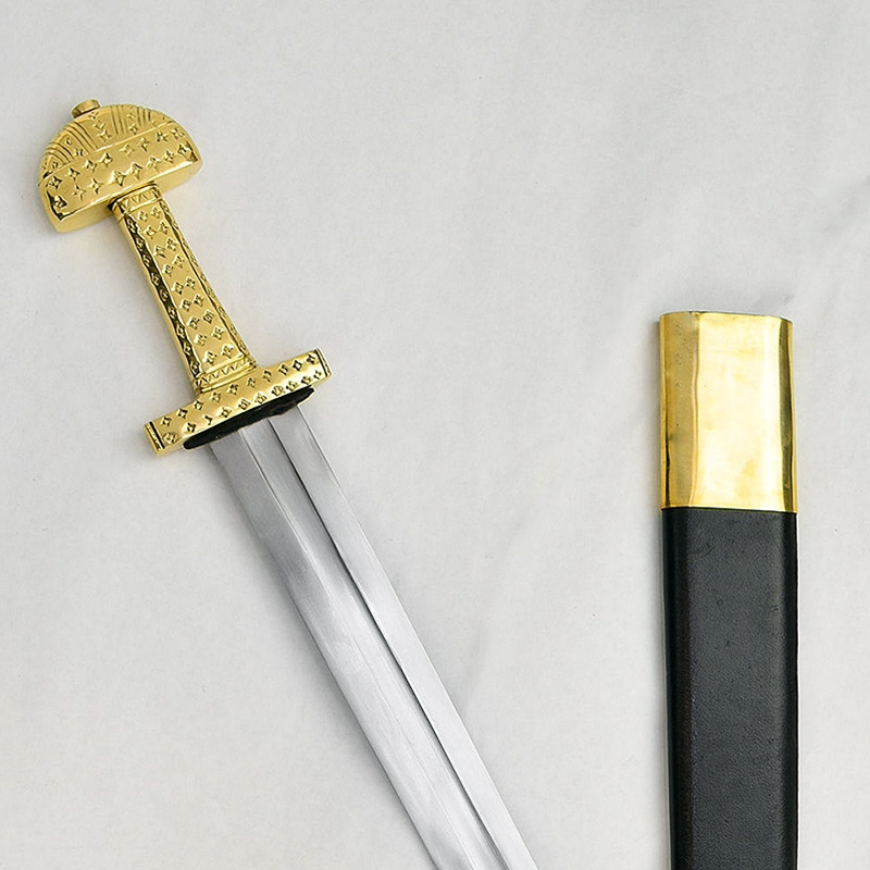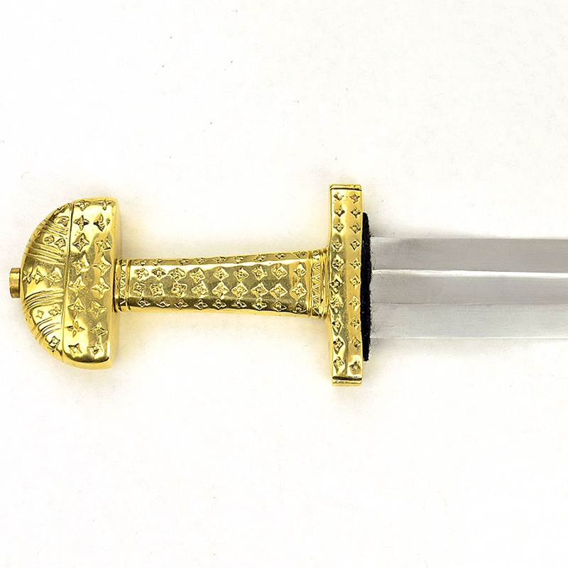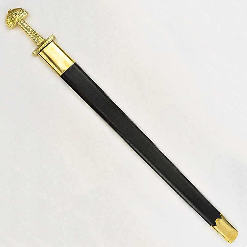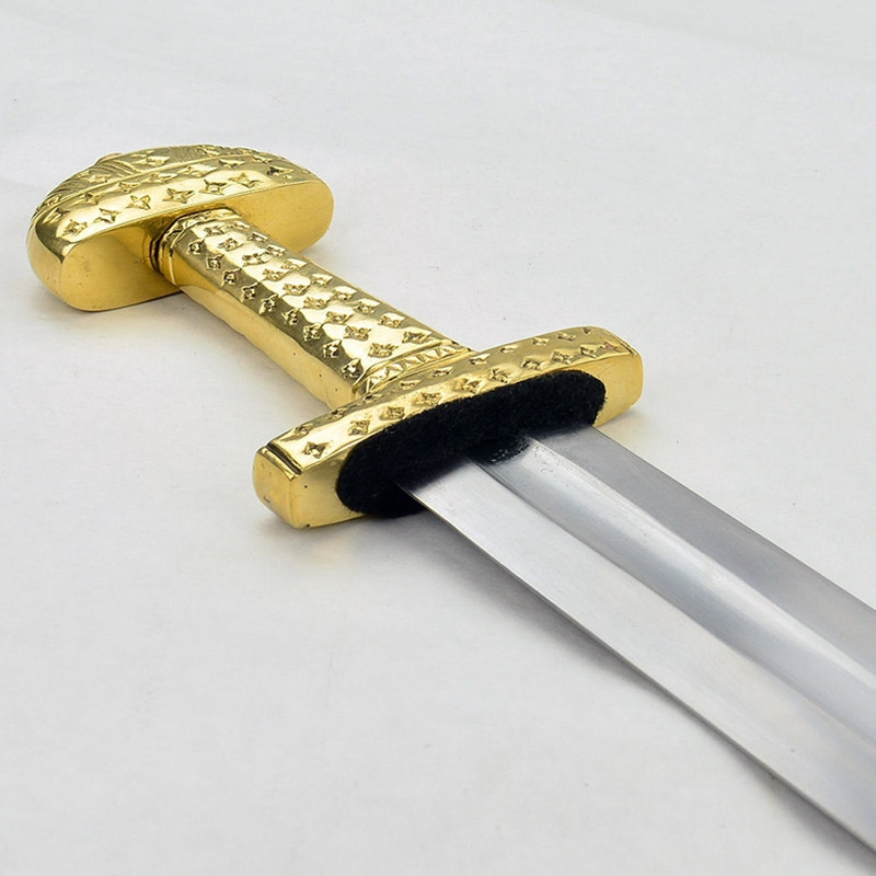 Viking Age Sword is a stunning example of how simple Viking weapons can be made into striking works of art. Like most Viking swords, this weapon features a relatively simple blade. Made from high carbon spring steel, this wide blade is one that would have been suitable for chopping and cutting, although its point allows for a devastating thrust. A fuller runs down the length of the blades spine, lowering the weight of the blade while allowing it to retain its incredible strength. The hilt is made entirely from brass and encompasses the blades single tang. The guard is a short, small crossbar, while the pommel is a half-wheel shape. Included with the sword is a leather-wrapped scabbard decorated with brass adornments.
