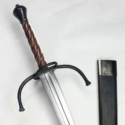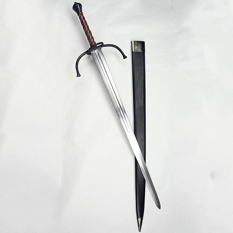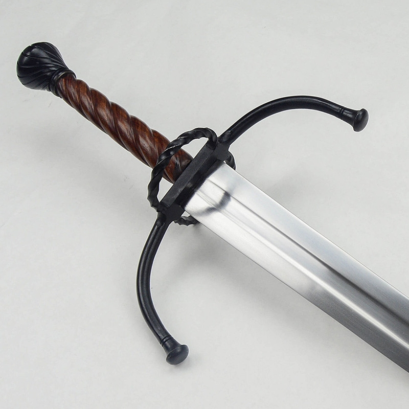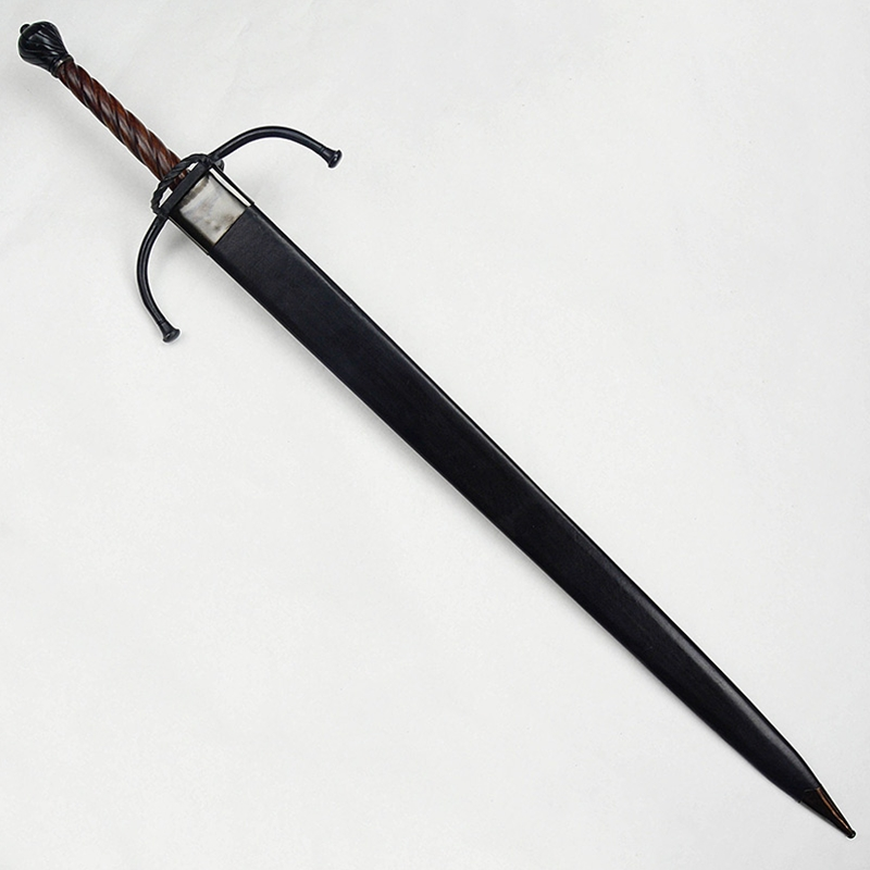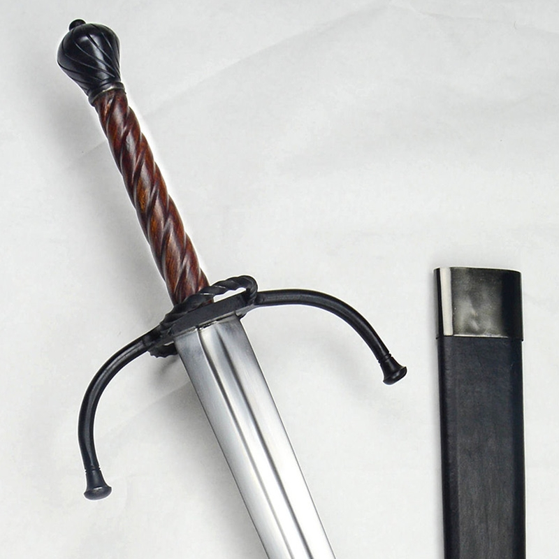 This German Longsword with Twisted Wood Grip, has a blade crafted from EN45 high carbon steel. The hilt is blackened steel and the grip is carved wood. The wood-core scabbard is overlaid in leather and completed with blackened metal fittings.