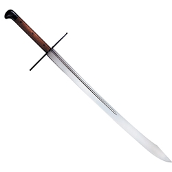 The Grosse Messer known throughout Germany as the “Big Knife”, hails from central and northern Europe where, in far off days of old, noblemen and peasants alike relied on it to protect hearth and home from the ravages of brigands, cut throats, outlaws and other assorted characters of ill repute. Due to its stout, wide blade and generously sized handle, it could be wielded in one or both hands and was capable of shearing through chain mail or cutting a man in half with a single strike. Our version of this elegantly simple yet remarkably effective weapon sports a hand forged blade of 1060 high carbon steel that’s so sharp we have used it to split a telephone book in half, with a single blow! The guard and heavy pommel are made from blued steel and feature rosewood handle scales riveted to the sword’s full tang. For convenience and safety, the Grosse Messer comes with a strong, handsome scabbard crafted from wood and covered in black leather. It is reinforced with a steel chape and throat that has been blued to match the guard and pommel.