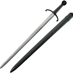 Well balanced, the 33 1/4 inch high carbon steel blade thrusts easily on foot or from horseback while the fuller lightens the blade for swift cuts while weaving your blade in combat. Counter balanced by the solid round steel pommel, the textured leather handle becomes one with your body and extension of your will. The arched hilt and quillons are classic in design of this type of cruciform sword and appropriate for kneeling in prayer.