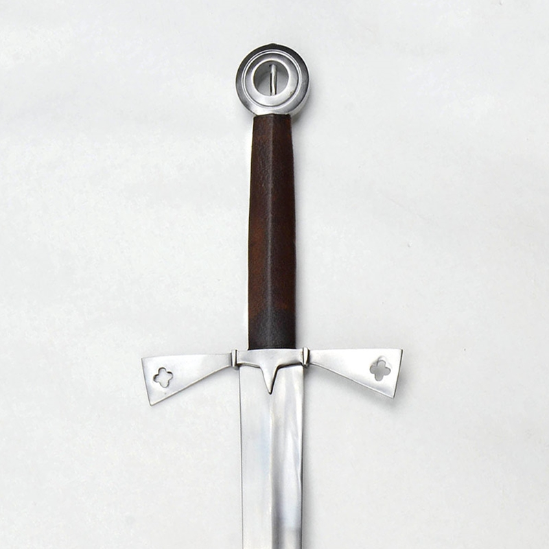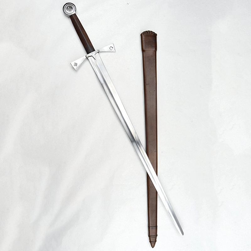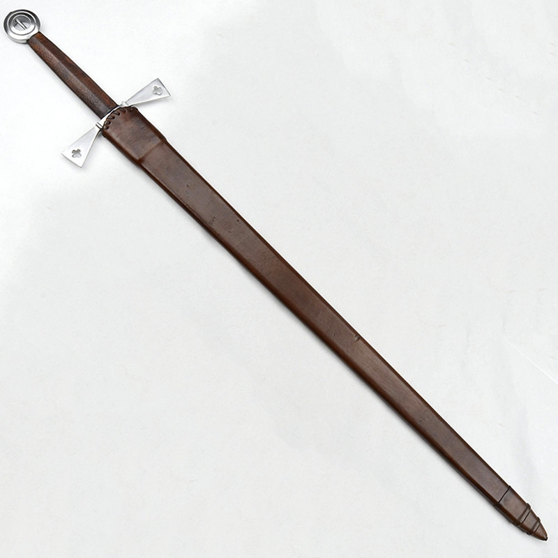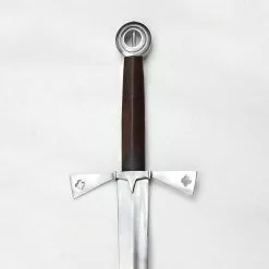 This Gaelic-Norse Gallowglass Longsword has a thick, blunted blade from EN45 high carbon steel – suitable for sport and stage combat, the edges are at least 2 mm thick. The hilt is of steel and the grip is wood with a tightly stitched overwrap of leather. The sword is paired with a wood-core scabbard which is bound in quality leather.