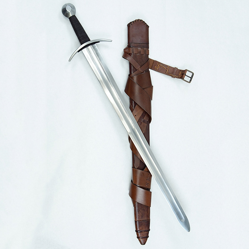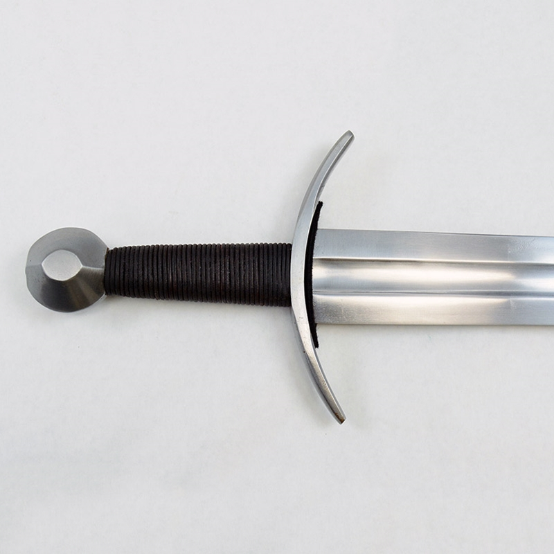 This Knightly sword is intended for stage and sport combat; it has a thick, EN45 high carbon steel blade with blunted edges and a weight-reducing central fuller. The hilt is steel and the leather-wrapped grip has a core of wood. The sword tang is robustly peened to the pommel to ensure a durable hilt construction.