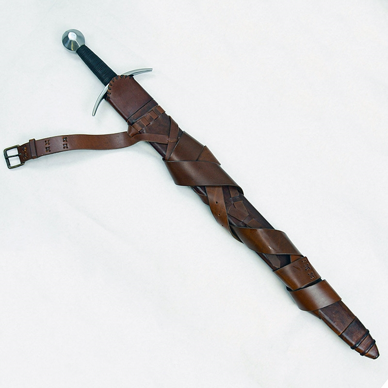 The wooden scabbard is overlaid in tight leather and is finished with an integrated and adjustable sword belt with an antiqued brass buckle.