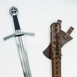 This Medieval Cruciform Pommel Sword has a blade crafted from EN45 high carbon steel. The hilt is steel and the wooden grip is overlaid in leather. A felt tab is atop the guard to give it a cushioned fit against the scabbard – it can be removed if desired. The scabbard and its separate belt frog with belt loops are of robust stitched leather.