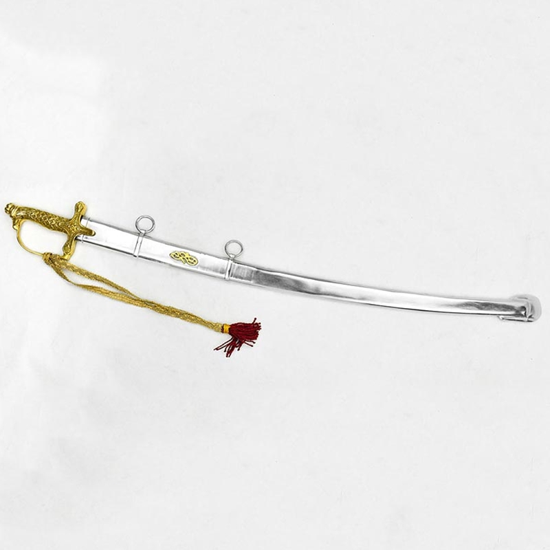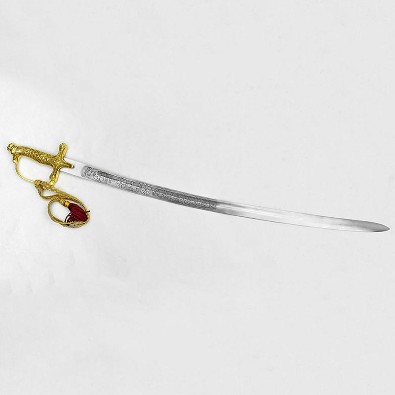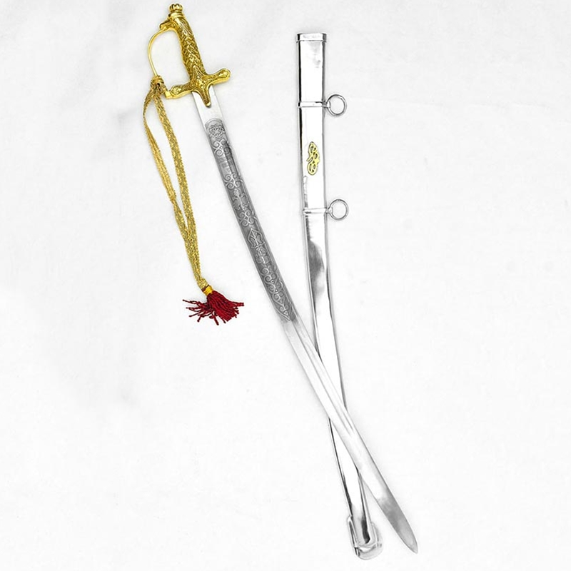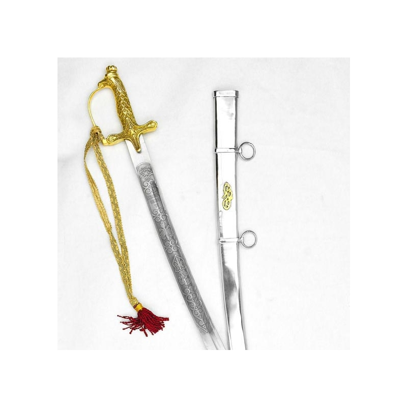 This reproduction of a sword once owned by General Wladyslaw Sikorski has a blade of high carbon steel which is etched on a single side with scrollwork filigree and the words Honor Ojczyzny (Honor and Fatherland). The blade is strongly mounted into a hilt of fine cast brass and is finished with a braided sword knot. The scabbard is crafted from steel and is completed with a pair of steel hanging rings.