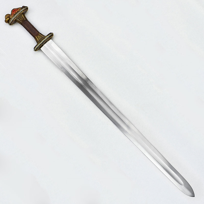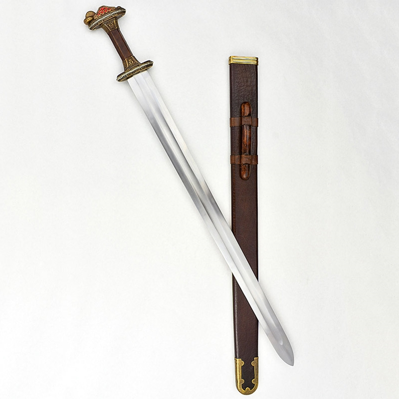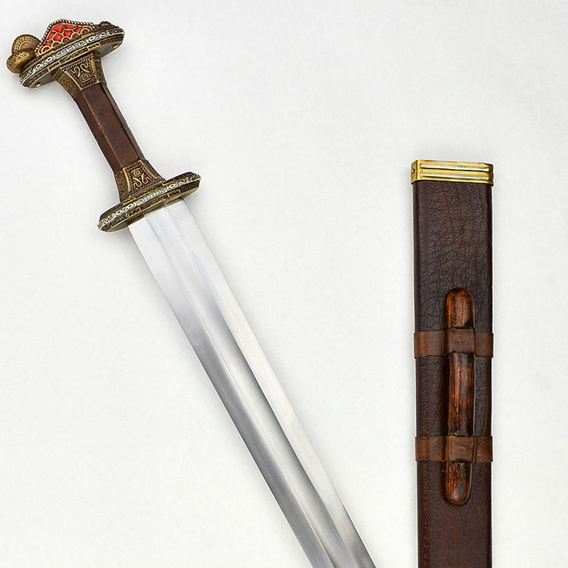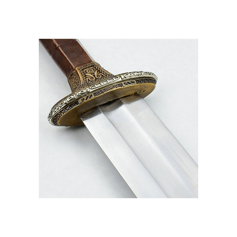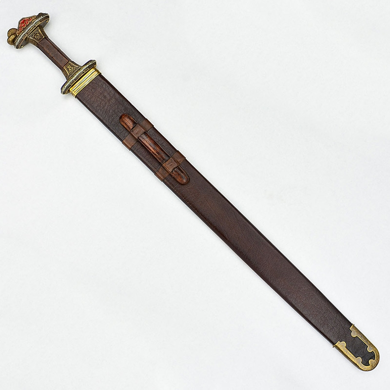 The sword is matched with a wooden scabbard which is bound in leather and fitted with an antiqued brass chape and locket. The suspension loop of wood is bound to the scabbard in leather banding and it can be used to hang your sword from your own baldric or belt.