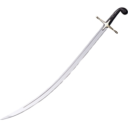 The Shamshir originated in Persia and spread throughout the former Ottoman Empire and beyond into India and even the Philippines. Its strongly curved blade was enduringly popular and absolutely ideal for delivering a devastating cutting stroke. And, contrary to popular belief, it was very effective at delivering rising, descending and hooking style thrusts! Typically, the curved Shamshir blade had a narrow cross section and a sharp point. It had a simple brass or steel crossbar hilt and an equally straightforward handle made from wood or animal horn that terminated in a distinctively bulbous pommel. This pommel was offset slightly to help the hand resist centrifugal force when making a hard cutting stroke. Our version of this historic saber replicates the original as closely as possible. The only modifications were to substitute a modern high carbon steel for the blade and to use black faux buffalo horn for the handle. Even the scabbard is a close copy of the original. It’s made of thick, black leather (so it won’t dull the blade) and reinforced by a brass throat and chape, and comes complete with dual suspension rings.