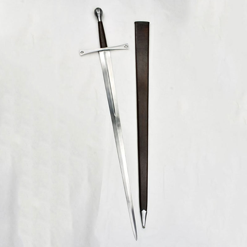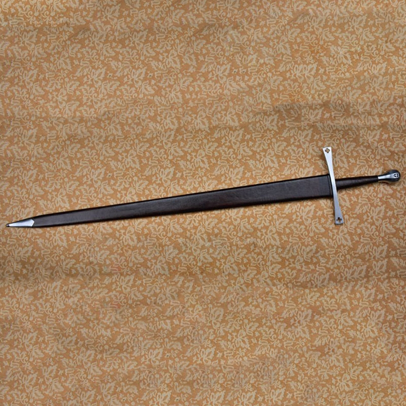 A typical 15th century sword the Shrewsbury Sword is a capable and hard-hitting bastard sword with a blade hand forged from C60 high carbon steel – a steel with properties similar to 1060 high carbon steel. The crossguard and pommel are crafted from resilient steel and the wooden grip is tightly bound in quality leather. A robust peen over the pommel anchors the blade tang into the hilt for a solid and robust overall construction. The sword is matched with a wood-core scabbard which is wrapped in high quality vegetable tanned leather to match the grip – a protective steel chape complete the sword.