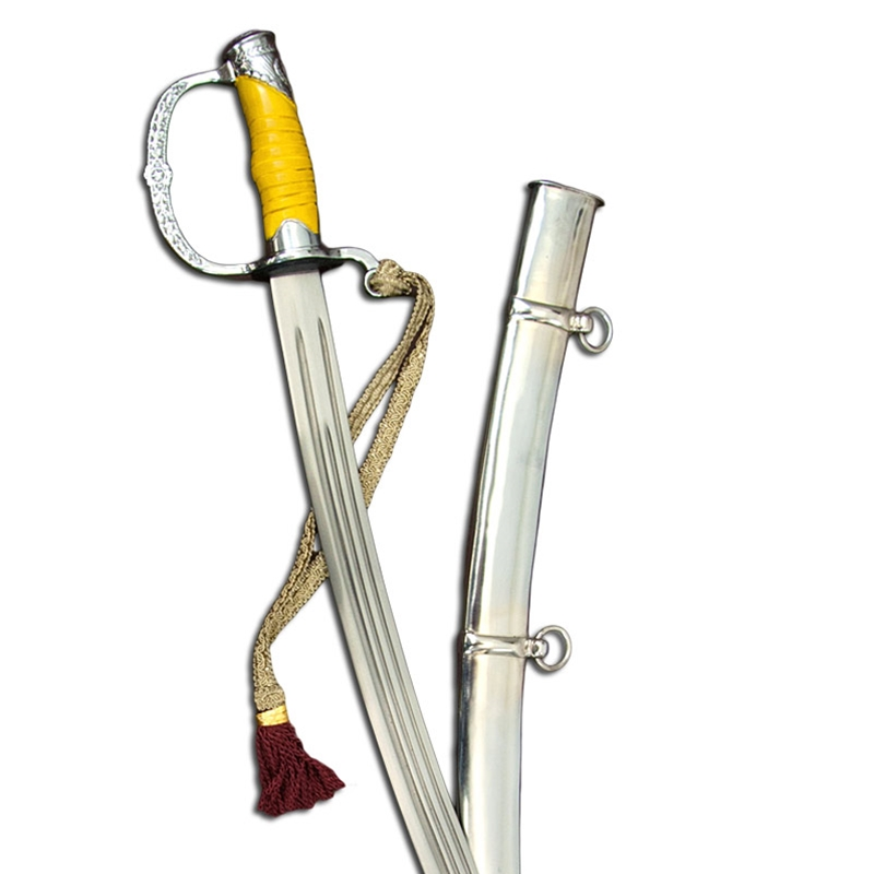 This replica Soviet Army Officer’s Sword has a tri-fullered blade from EN45 high carbon steel. The hilt is of chromed metal and is embossed with the Soviet Red Star in laurel leaves and the iconic hammer and sickle. The guard it is ornamented with a brocade sword knot. The grip is carved wood with a yellow painted finish. The sword is accompanied with a steel scabbard with steel hanging rings.