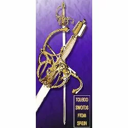 Gorgeous Swept Hilt Spanish Rapier. One of the finest handcrafted Spanish Rapiers available. Gorgeous Swept hilt design. Gold plated hilt. Tempered Toledo Steel Blade. Excellent balance and feel. A true swordsman’s blade. Overall Length 45.5″ 2.4lbs.