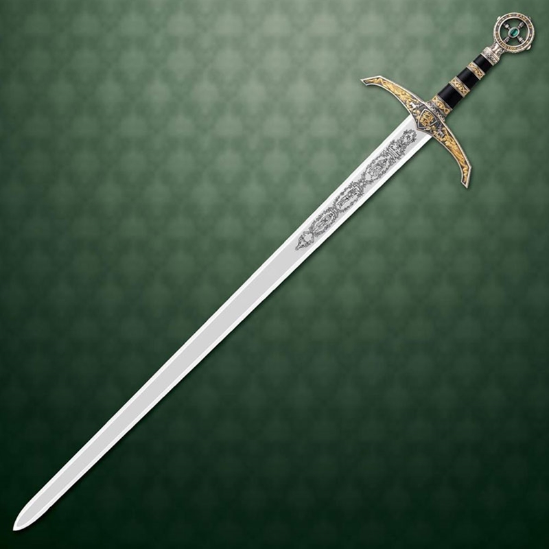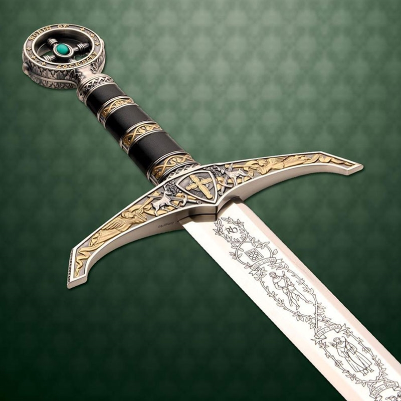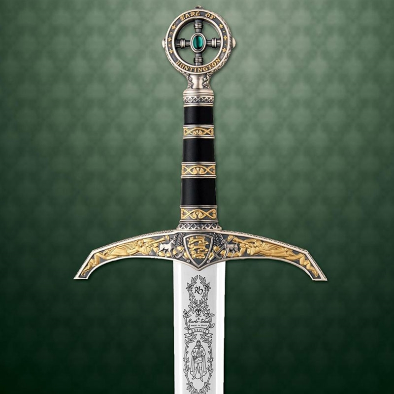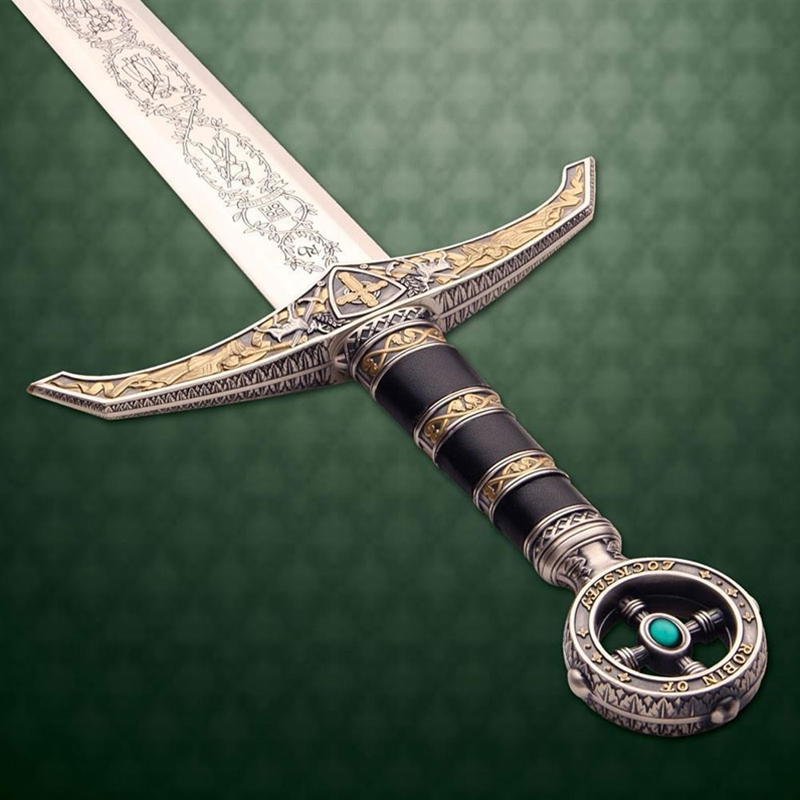 Based on the famous sword of the “Prince of Thieves” comes this magnificent blade. The hilt has a rich palette of antiqued silver and gold, with embossed ornaments of sword, stag and heralding trumpeter angels, all offset with its deep green stone and dark leather handle. The pommel bares the renowned insignia “Robin of Locksley”. Intricate etch-work patterns dress the blade, which is of 420 stainless steel and mirror polished. Forged with Marto’s world-renown quality, the Robin Hood Sword is a worthy and popular addition to any sword enthusiast’s collection. Decorative use only. Intended for wall decor, displays, home or office decor or for costume.