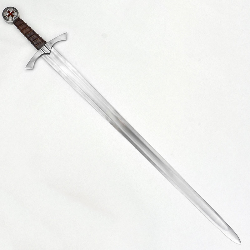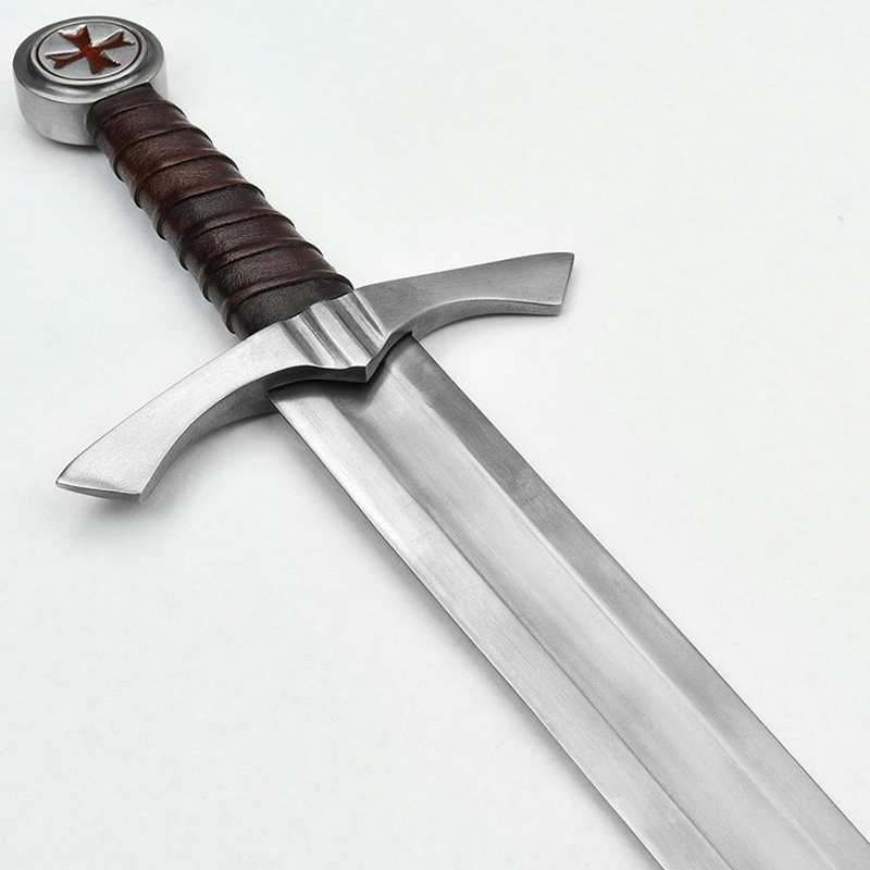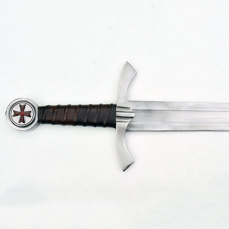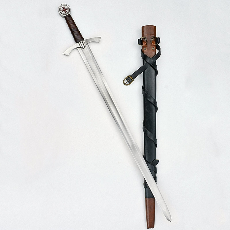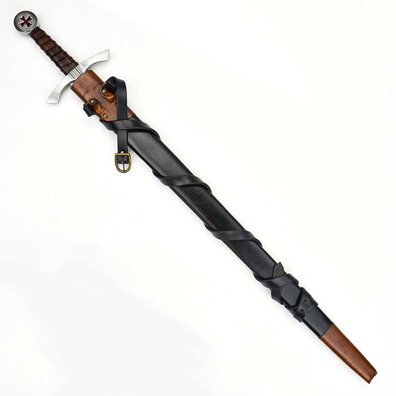 The sword comes with a scabbard of thick leather with sturdily stitched construction. Its antiqued brass hanging rings are connected to an integrated sword belt which can be adjusted to size with its matching antiqued brass buckle.