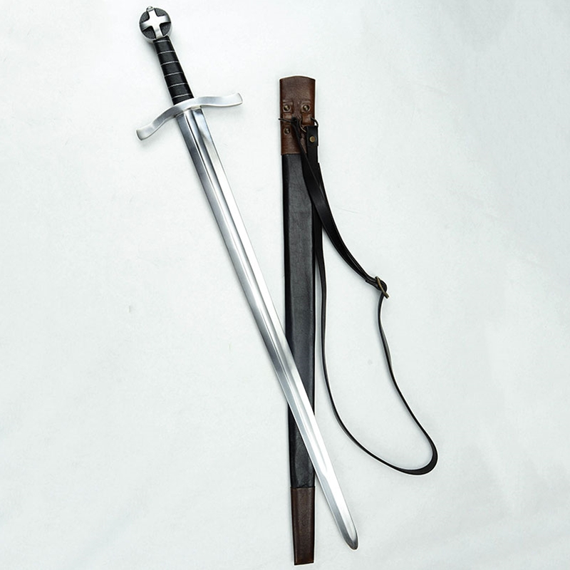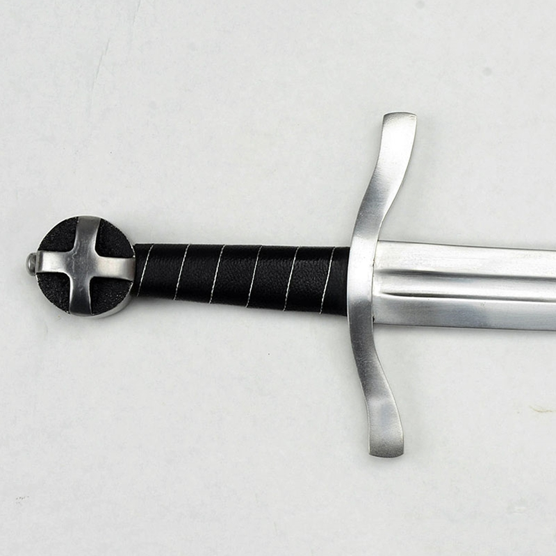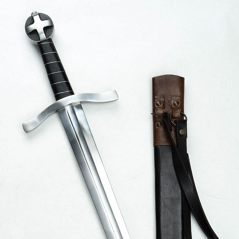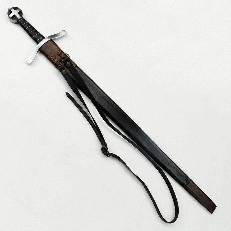 This Teutonic Arming Sword has blade of high carbon steel; the crossguard and pommel are steel and wooden grip is finished with a tight leather wrap and inlaid with twisted steel wire. Included is a durable leather scabbard with an integrated hanging baldric. The baldric has an antiqued brass buckle which allow its fit to be adjusted.