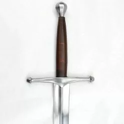 This German longsword has a thick blade with edges that are at least 2 mm thick to make it suitable for sport and stage combat. The blade is crafted from EN45 high carbon steel – the crossguard and pommel are steel and the blade tang is peened over the pommel for a durable overall construction. The grip is wood overlaid in tight leather.