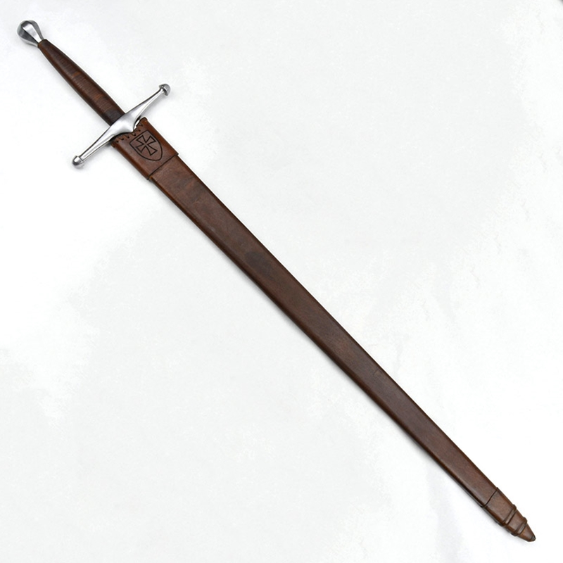 The sword comes with a wood-core scabbard which is wrapped in stitched and fitted leather. Inscribed on the locket on a single side is a Teutonic Cross. Please Note that it is normal for this item to have a gap between the crossguard and scabbard when fully sheathed. There is matching dagger to this sword which is sold separately (AH-6991F).