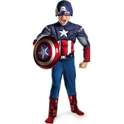 With The Avengers Captain America Classic Muscle Chest Toddler Costume hewill be the leader of the Avengers team. Steve Rogers was a scrawny kid from the Bronx in World War II who wanted to go to war but was denied until he was recruited for a new super soldier project where he became Captain America. He was frozen in ice until found in modern day when he was recruited by Nick Fury for the Avengers. Assemle your teammates, Iron Man, Thor, Black Widow, Hawkeye and the Hulk and get read for the battle of your lives.  The Avengers Captain America Classic Muscle Chest Toddler Costume includes a jumpsuit with muscle torso and arms, and character headpiece.