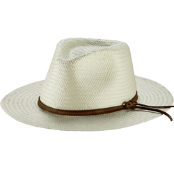 features a 2 3/4″ brim, a fedora pinched crown, and a leather band. Available in medium (7 1/8), large (7 1/4), and extra large (7 1/2).