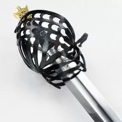 The sword comes with a wooden scabbard which is bound in form-fitted and tightly stitched red leather with a brass tip. Leather sword hangers are fitted onto the scabbard and their integrated brass buckles can be used to adjust then height and angle of the sword scabbard when slung from a sword belt. An adjustable sword belt with an antiqued brass buckle is included.