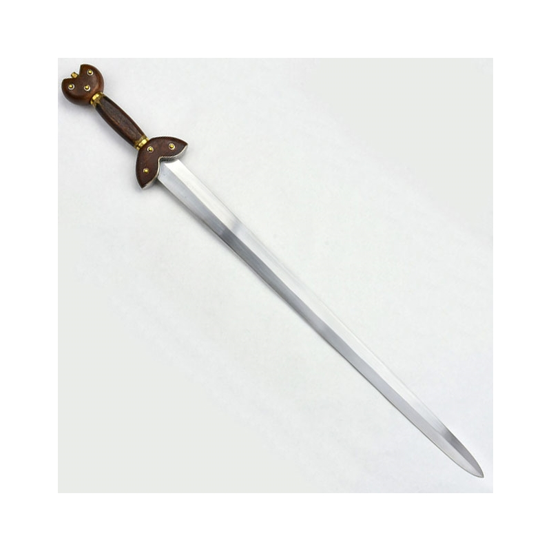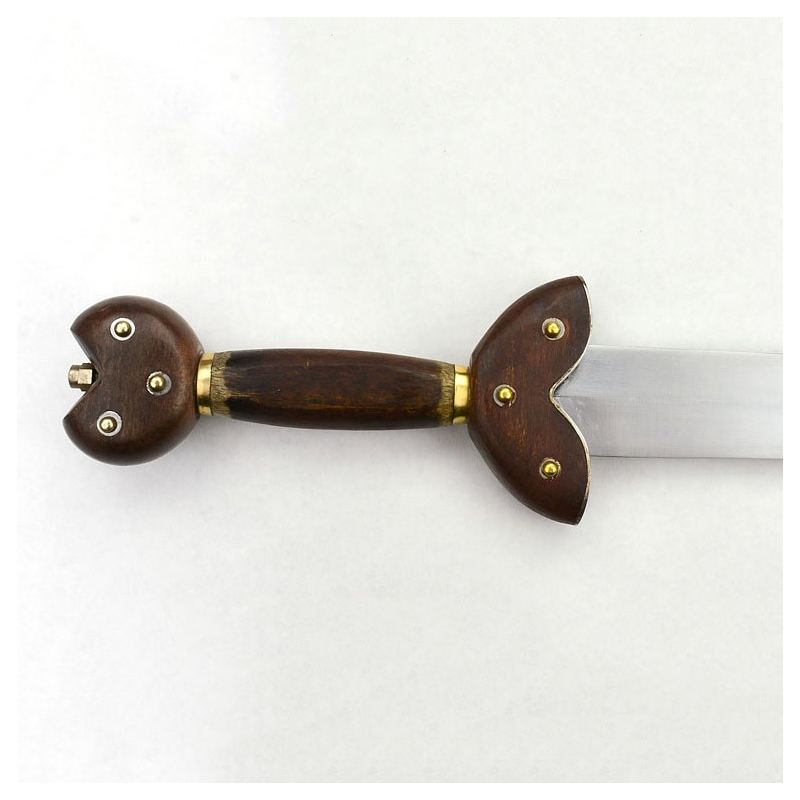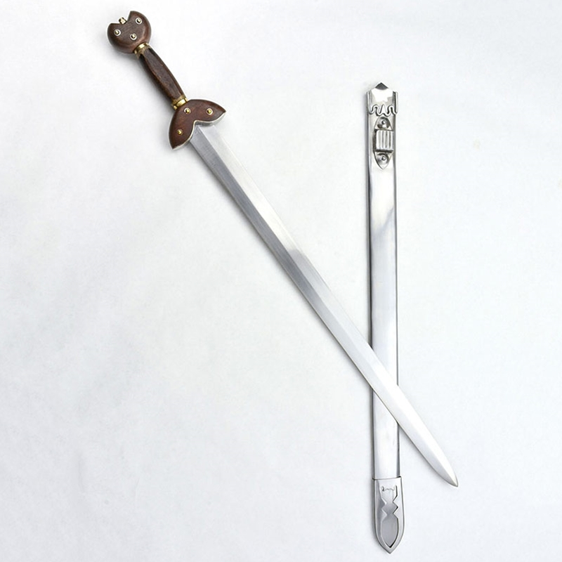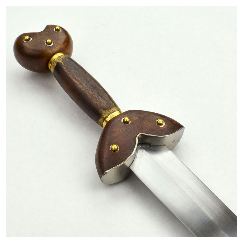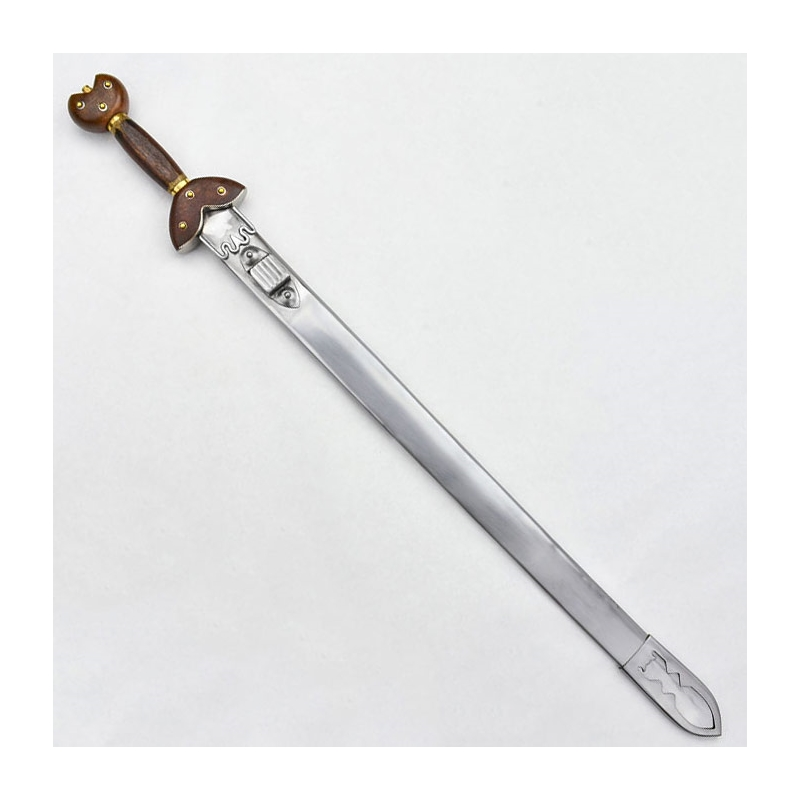 This Celtic Sword has a blade forged from high carbon steel which is durably mounted into a grip of carved and polished hardwood. The hilt is embellished with ferrules and rivets of brass. The guard plate is fashioned from steel and the sword is matched with a steel scabbard.